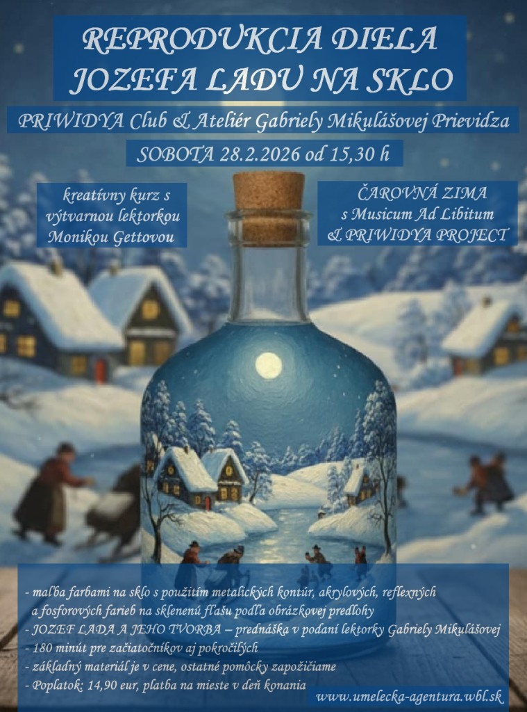 - SOBOTA 28.2.2026 od 15,30 h – ČAROVNÁ ZIMA 2026 – zážitkovo – umelecké podujatie s Musicum Ad Libitum & PRIWIDYA PROJECT v PRIWIDYA Clube & Ateliéri Gabriely Mikulášovej v Prievidzi, ul. Košovská cesta 24