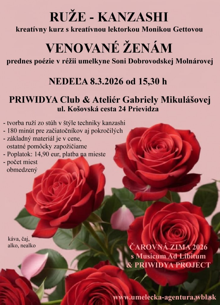 - NEDEĽA 8.3.2026 od 15,30 h – ČAROVNÁ ZIMA 2026 – zážitkovo – umelecké podujatie s Musicum Ad Libitum & PRIWIDYA PROJECT v PRIWIDYA Clube & Ateliéri Gabriely Mikulášovej v Prievidzi, ul. Košovská cesta 24