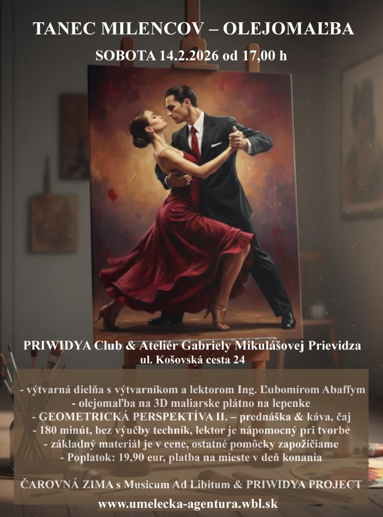- SOBOTA 14.2.2026 od 17,00 h – ČAROVNÁ ZIMA 2026 – zážitkovo – umelecké podujatie s Musicum Ad Libitum & PRIWIDYA PROJECT v PRIWIDYA Clube & Ateliéri Gabriely Mikulášovej v Prievidzi, ul. Košovská cesta 24