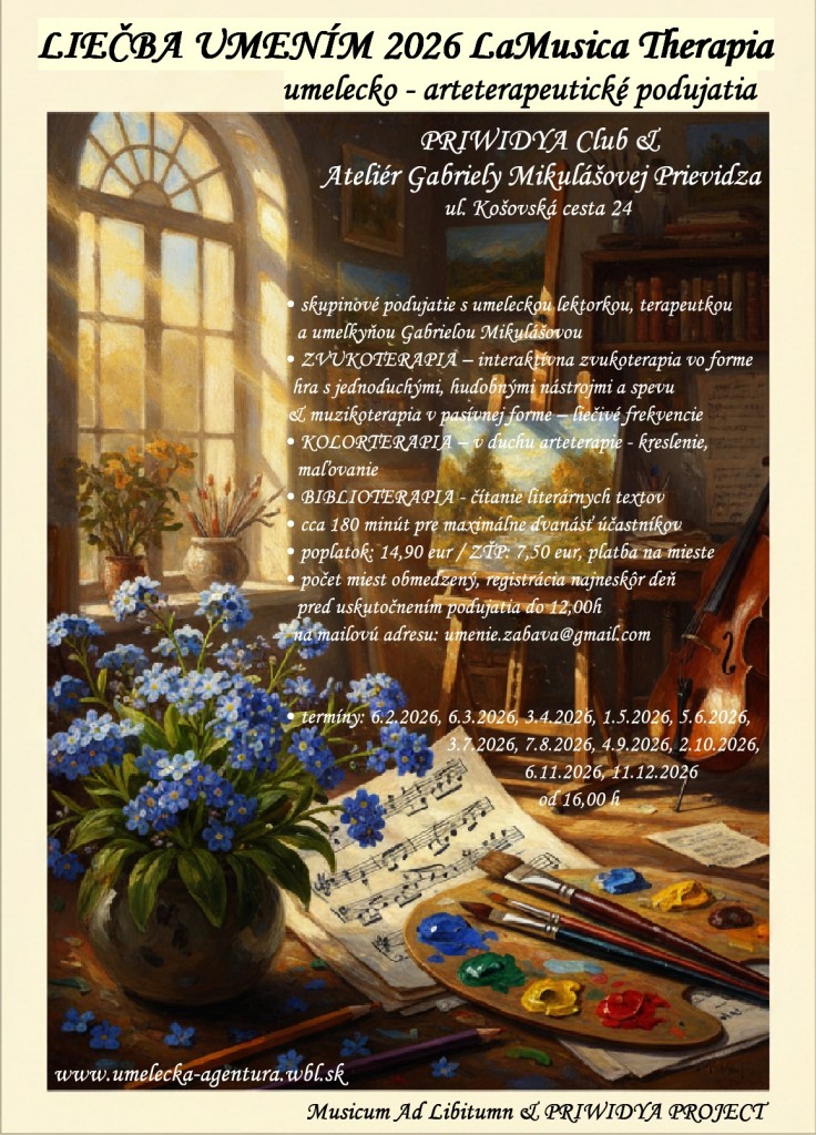 - PIATOK 6.2.2026 od 16,00 h - LIEČBA UMENÍM 2026 LaMusica Therapia - umelecko - arteterapeutické podujatia s Musicum Ad Libitum & PRIWIDYA PROJECT v PRIWIDYA Clube & Ateliéri Gabriely Mikulášovej, ul. Košovská cesta 24 Prievidza
