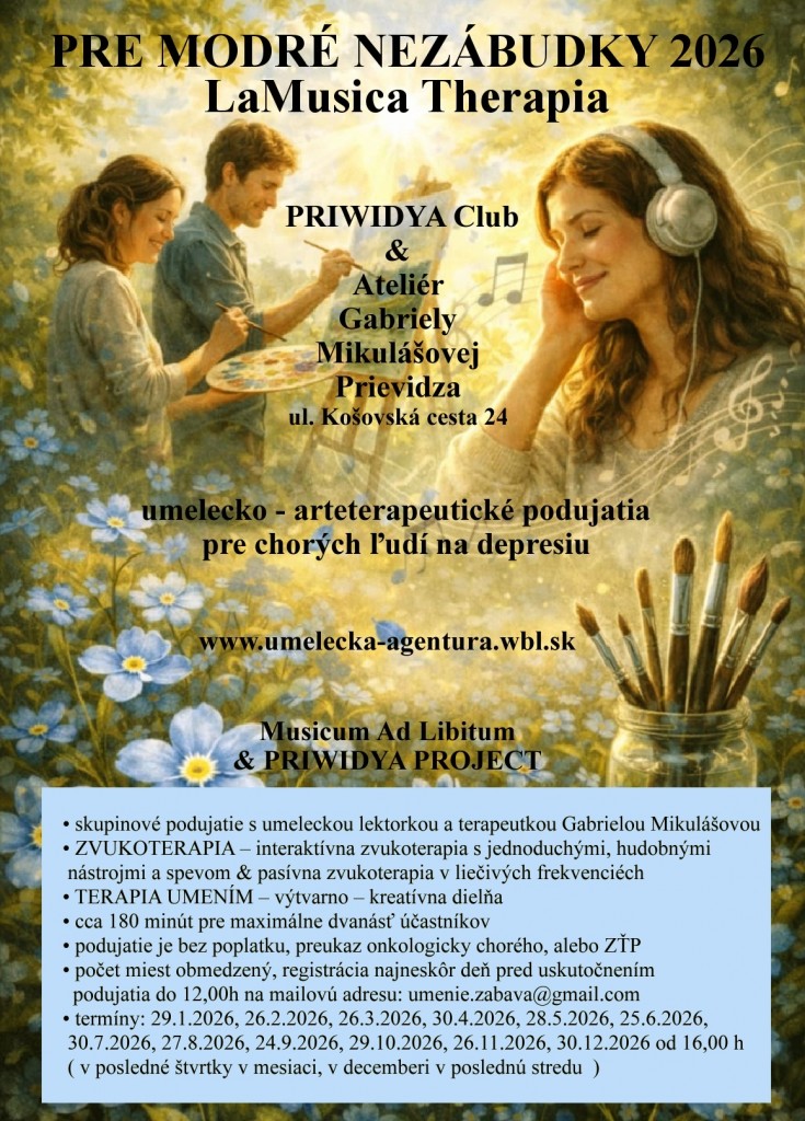 - ŠTVRTOK 12.3.2026 od 16,00 h - PRE MODRÉ NEZÁBUDKY 2026 - umelecko - arteterapeutické podujatia pre chorých ľudí na depresiu s Musicum Ad Libitum & PRIWIDYA PROJECT v PRIWIDYA Clube & Ateliéri Gabriely Mikulášovej, ul. Košovská cesta 24 Prievidza
