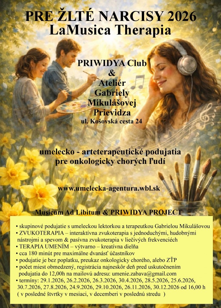 - ŠTVRTOK 26.3.2026 od 16,00 h - PRE ŽLTÉ NARCISY 2026 - umelecko - arteterapeutické podujatia pre onkologicky chorých ľudí s Musicum Ad Libitum & PRIWIDYA PROJECT v PRIWIDYA Clube & Ateliéri Gabriely Mikulášovej, ul. Košovská cesta 24 Prievidza