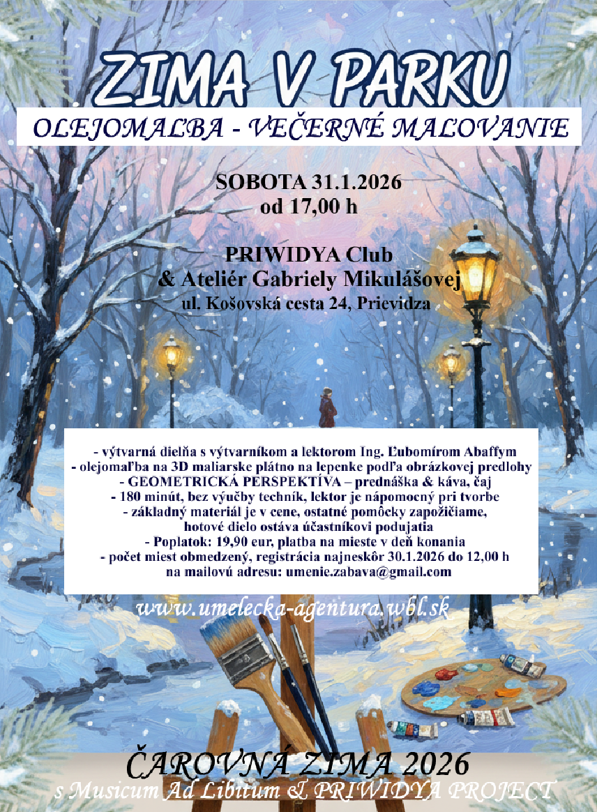 - ZIMA V PARKU – OLEJOMAĽBA – VEČERNÉ MAĽOVANIE - výtvarná dielňa s výtvarníkom a lektorom Ing. Ľubomírom Abaffym